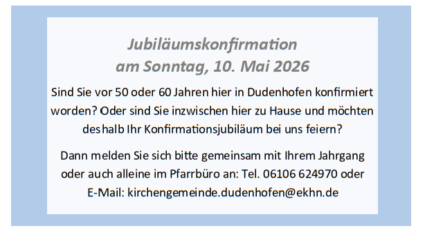 Anmeldung für Jubiläumskonfirmation am Sonntag, 10. Mai, jederzeit möglich im Pfarrbüro 06106 624970 oder kirchengemeinde.dudenhofen@ekhn.de