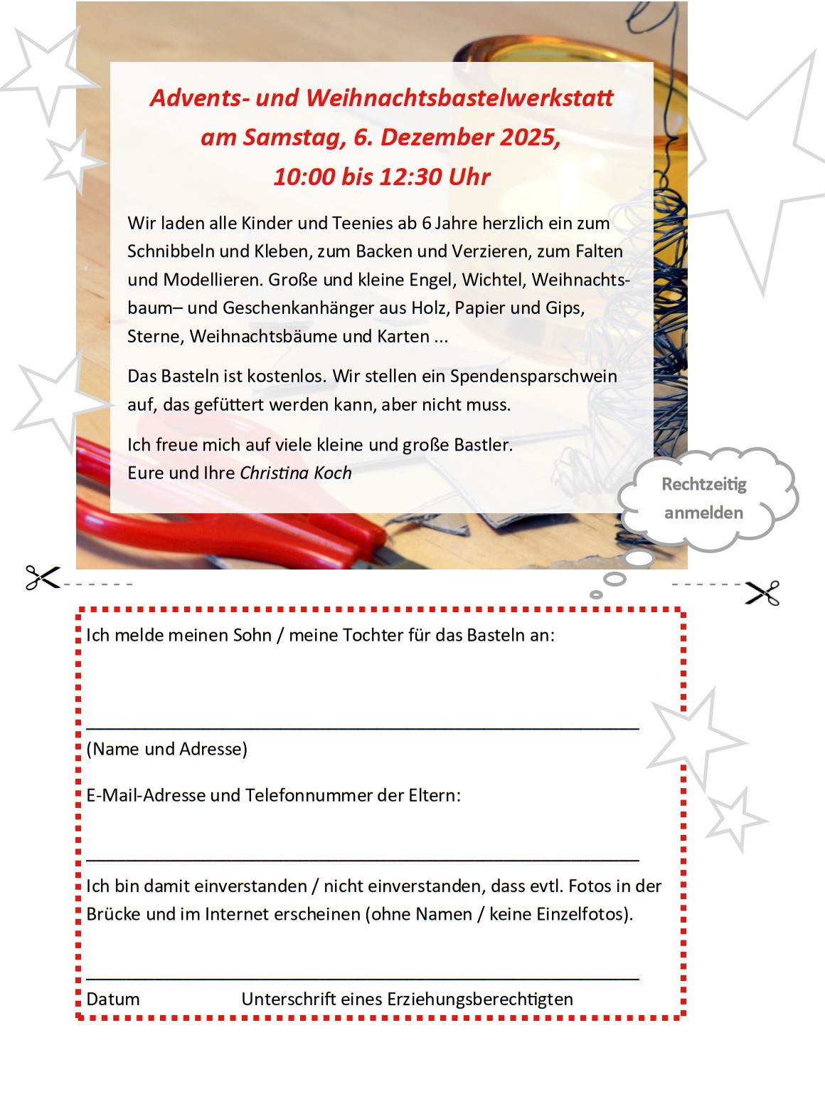 Die Anmeldung zum Adventsbasteln für Kinder ab 6 Jahren am Samstag, 6. Dezember (10:00 - 12:30) ist bereits möglich (siehe Hinweis weiter unten auf dieser Seite). Nutzen Sie den Anmeldezettel oder melden Sie Ihr Kind im Gemeindebüro an.